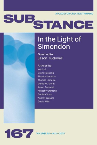 Ecology is a question because the human is a technological animal, because the human relation to nature is technological; ecology thus concerns the originary technicity of the human. In developing that thesis against the background of the work of Simondon, this article argues that the analysis of technicity developed in On the Mode of Existence of Technical Objects is fundamental to Individuation in Light of Notions of Form and Information, preventing the latter work from falling back into the anthropomorphism it seeks to avoid. In Simondon’s terms, the technical object would function as a type of internal resonance throughout Individuation, a metastability that phase-shifts the concept with respect to itself. Read through this lens, his ideas shed a different light on what transpires between human and environment, and his generalizable “transduction” destabilizes even as it undergirds his schema of individuation.